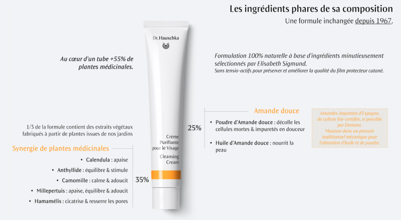 Sa composition riche de plus de 55% d’extraits naturels de plantes médicinales nettoie tout en préservant le film hydrolipidique de la peau. Les Amandes importées d’Espagne et issues d’une culture bio, certifiée en partie par le label biodynamique Demeter, constituent 25% de sa formule et sont utilisées sous forme de poudre pour le nettoyage mécanique et en huile afin de nourrir la peau. 35% d’extraits naturels de plantes médicinales complètent sa composition afin de resserrer les pores, d’équilibrer et de clarifier la peau. Avec plus d’un tiers de ses extraits naturels produits dans nos jardins et ferme d’Eckwälden, la Crème Purifiante pour le Visage est un parfait exemple de l’expertise Dr. Hauschka du champ jusqu’au tube.