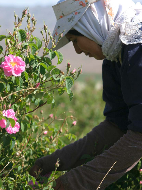 Mahdi Maazolahi est toujours en mouvement. Agile, il s’active aux côtés de Hans Supenkämper dont le chapeau marron clair orné d’un cordon est désormais une marque distinctive. Hans Supenkämper est satisfait. Les écorces de pistache se sont complètement décomposées, la terre qui s’est formée est finement grumelée, ni trop sèche ni trop humide, et sent bon. Il remet soigneusement la bâche en place car il faut empêcher au maximum l’évaporation dans cette région désertique. Que des roses aussi fournies prospèrent dans cette zone marquée par le manque d’eau tient presque du miracle. Les arbres sont rares, seules quelques traces de vert émaillent la terre aride au cœur de ces montagnes en pleine solitude. On n’entend que le silence qui enveloppe les cueilleuses dans le champ de roses d’à côté. Elles récoltent des pétales de roses de Damas. Sur leurs hanches, elles ont noué des sacs qui se remplissent petit à petit de fleurs fraîchement cueillies. Quand ils sont pleins, elles les vident dans des sacs plus grands qui sont emmenés à la distillerie par leurs maris. Sur le rose vif des buissons, leurs robes et leurs foulards se détachent en notes multicolores.